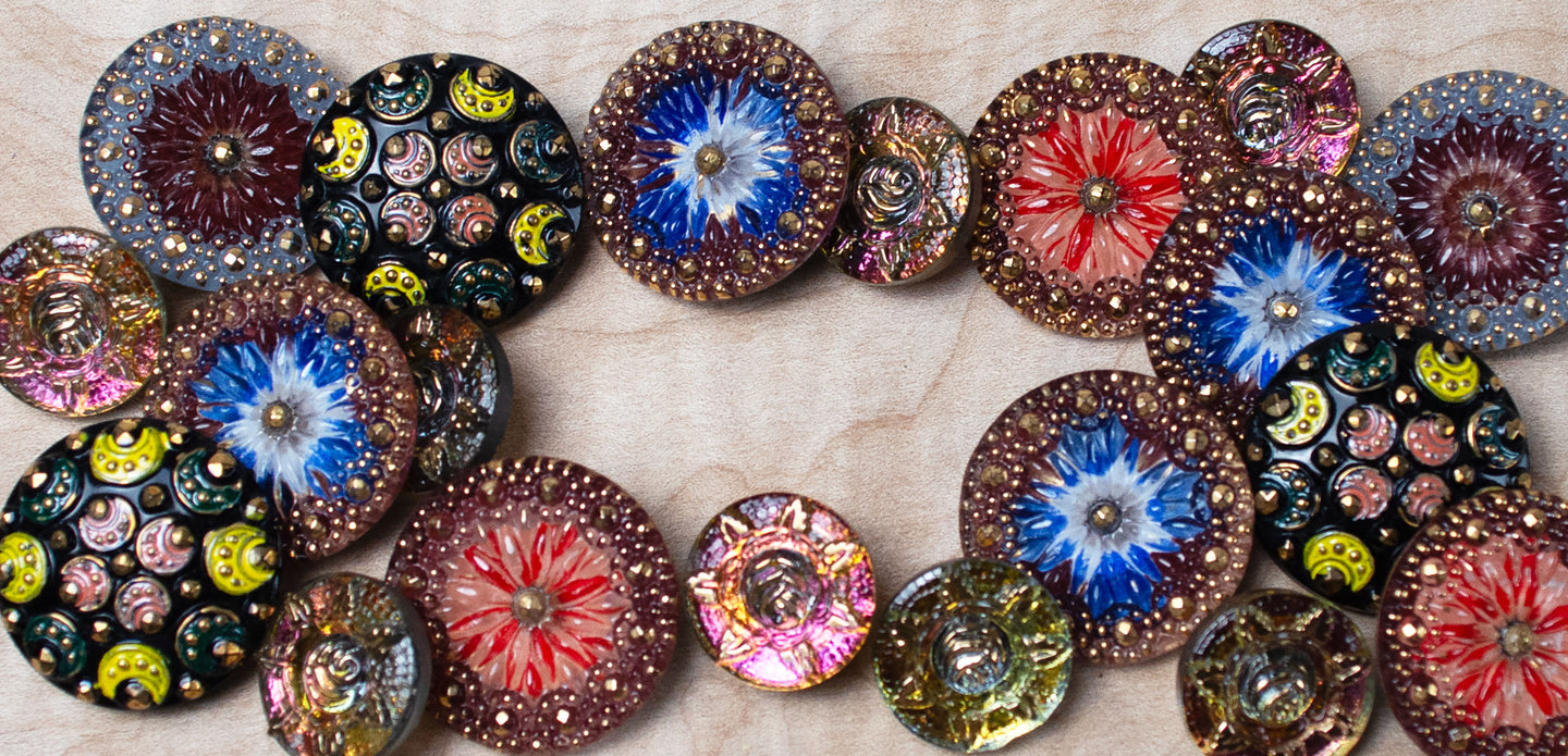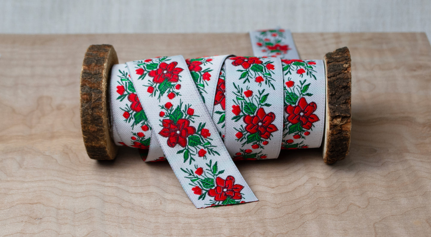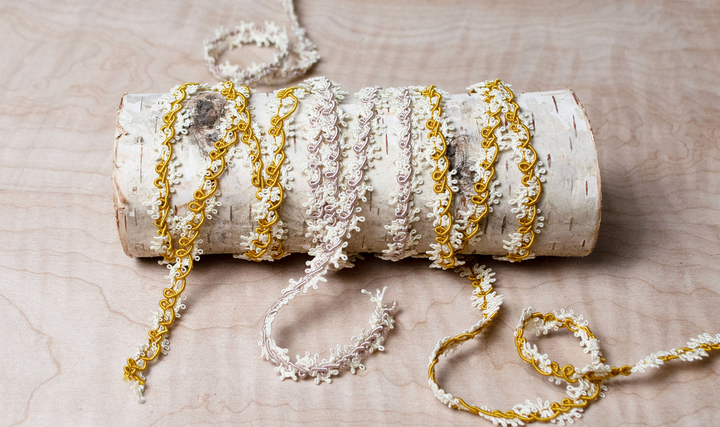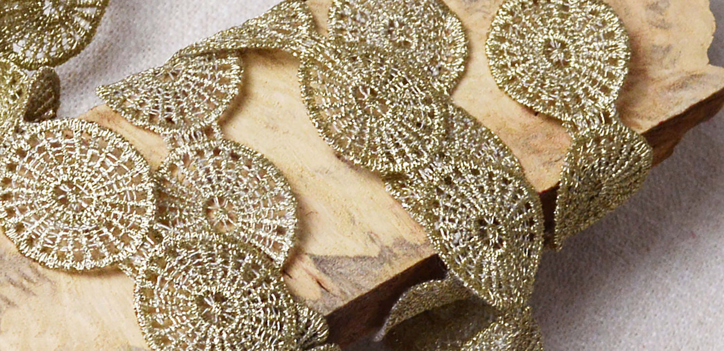 A Saturday afternoon shopping adventure found this double-gauze pheasant blouse. Though it was fine as-is, we are obsessed with embellishing all things, and knew we could make it more. Enter the "Loops Lace," which was stitched quickly around the bottom hem by machine with a small zig-zag stitch. And yes, our favorite notion, the stiletto, helped us in this process. After perusing our shelves for just one more...