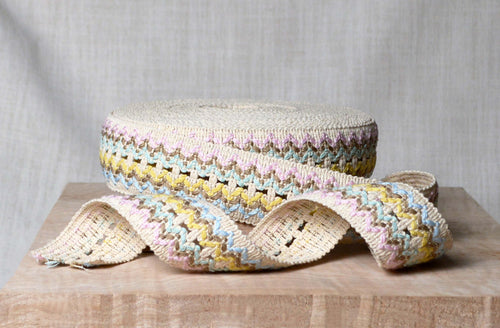 A Saturday afternoon shopping adventure found this double-gauze pheasant blouse. Though it was fine as-is, we are obsessed with embellishing all things, and knew we could make it more. Enter the "Loops Lace," which was stitched quickly around the bottom hem by machine with a small zig-zag stitch. And yes, our favorite notion, the stiletto, helped us in this process. After perusing our shelves for just one more...