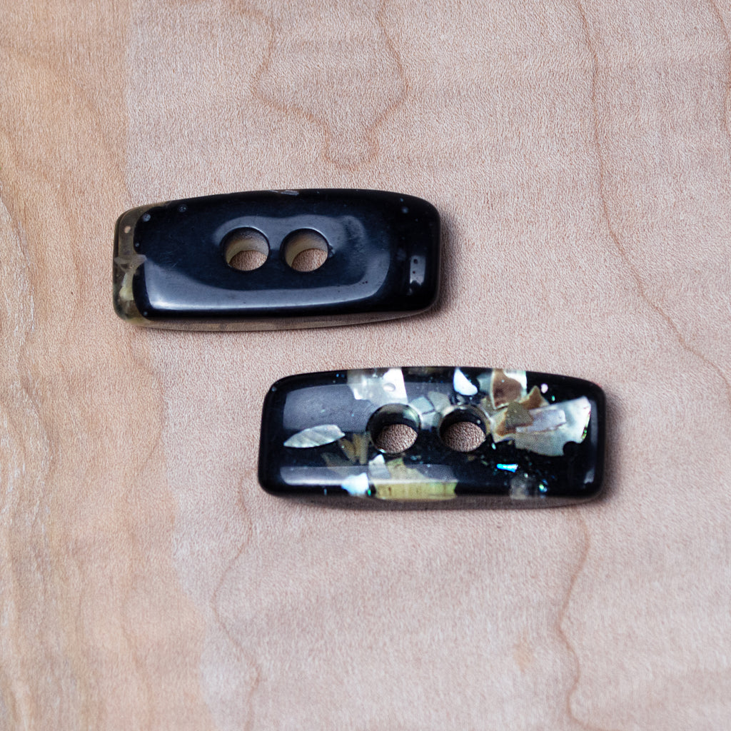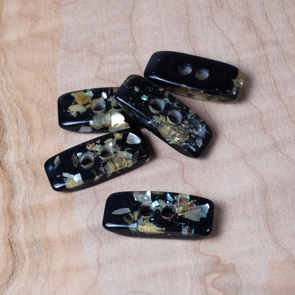 Shimmering flecks and sparkles float about in the most astronomical way! It's not only the cool shape, but also the iridescent flecks against the black-as-night base, which make this button stellar. The star of your project can be this button when sewn up the front of a wool jacket, blazer, or coat.
