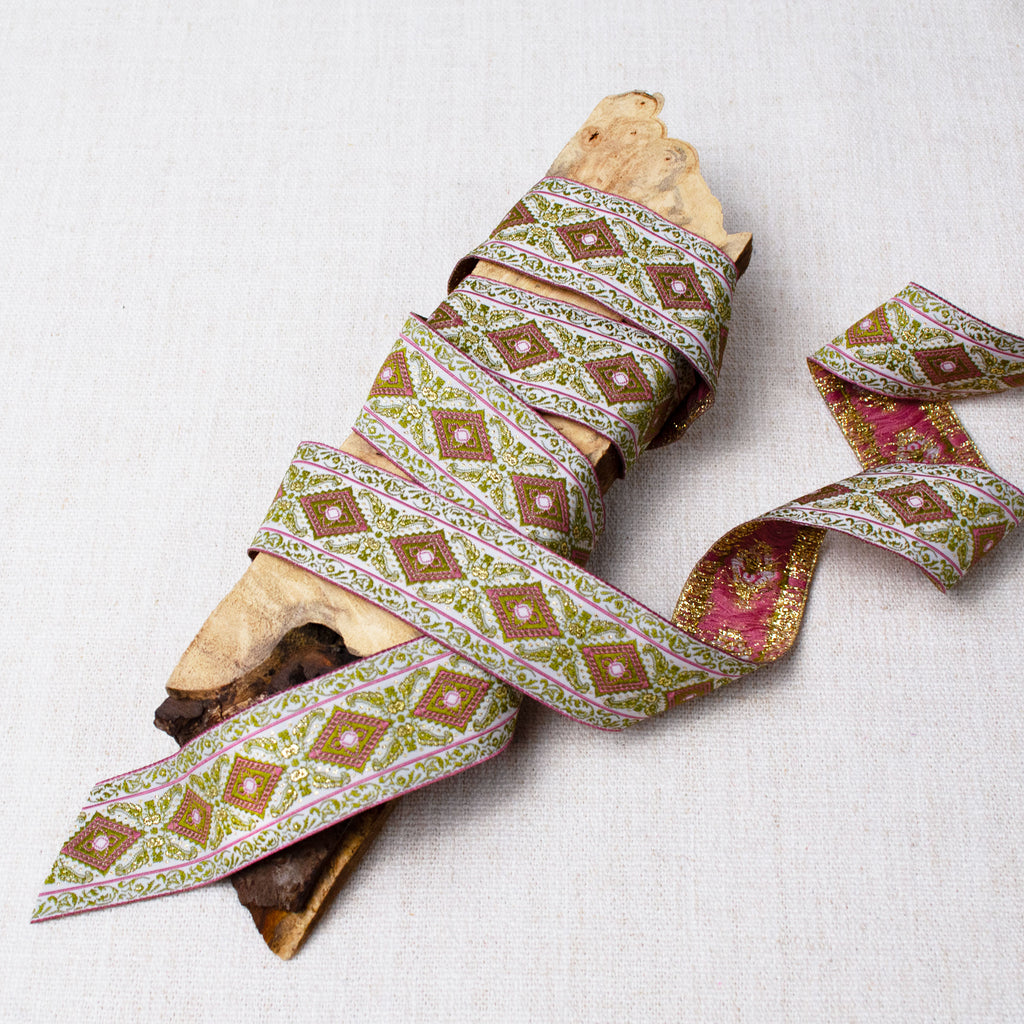Let this fanciful jacquard lend a special melody to a work of apparel, accessory, or home decoration. Flourishes of green, pink, and shimmering gold adorn a backdrop of cool white.