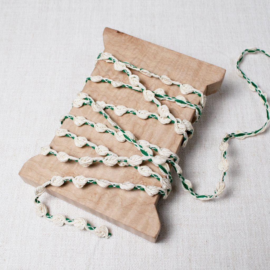 Get into some creative mischief with this little treat! Ecru satin threads with a slight sheen twist into little "knots" along a background of shamrock green yarns. When stitched onto an item, the green just slightly peeks around the corner. Delightful on a blouse, child's dress, or home decor.