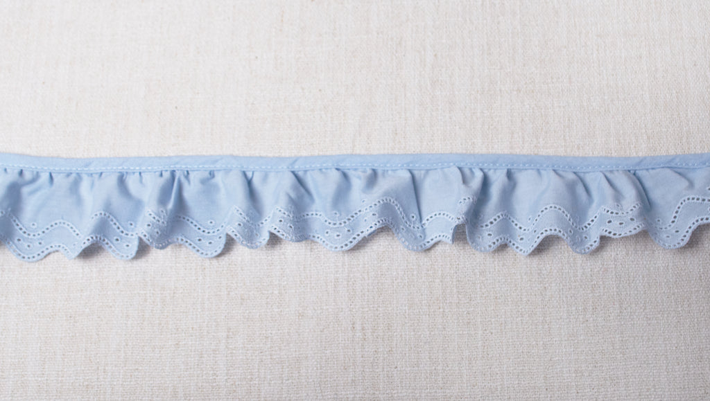 Eyelets have been around since the 16th century, and are still admired today! Gentle waves dotted with tiny embroidered circles create this graceful eyelet. Woven of 100% cotton and already gathered so you don't have to do it. Finish a ruffled hem, the bottom or a sleeve or circle a collar with this pretty piece.